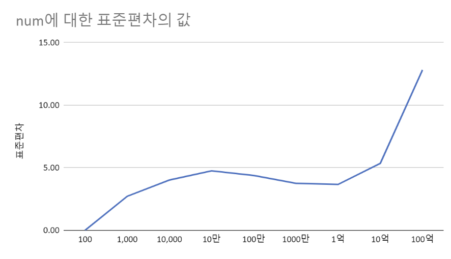 100억 개의 경우 모듈러스 연산을 사용했을 때 랜덤 엔진을 사용한 것보다 표준편차가 무려 13배가 더 컸다(표준 편차가 클수록 안 좋다).