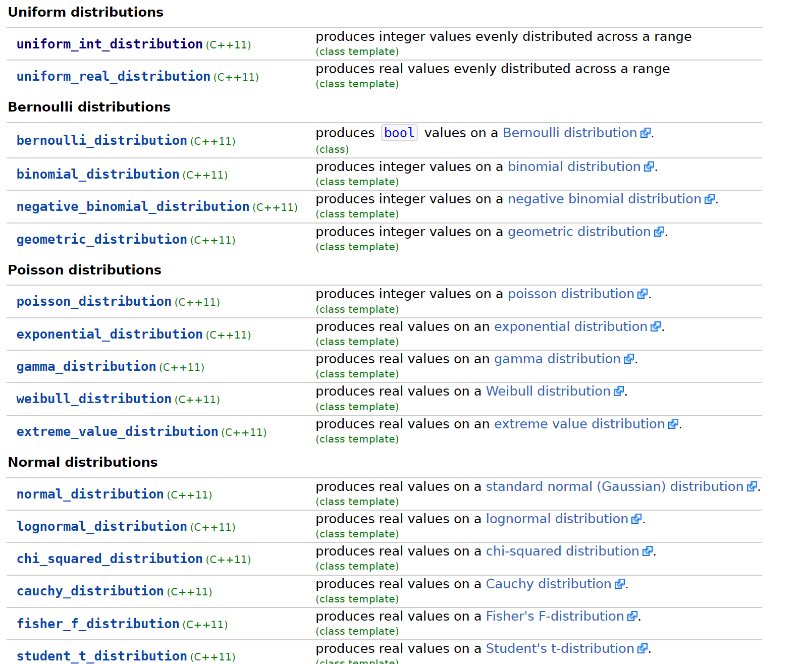 그리고 uniform distribution 이외에 다른 분산기가 필요할 경우, cpp reference 혹은 Microsoft Learn에서 확인할 수 있다.