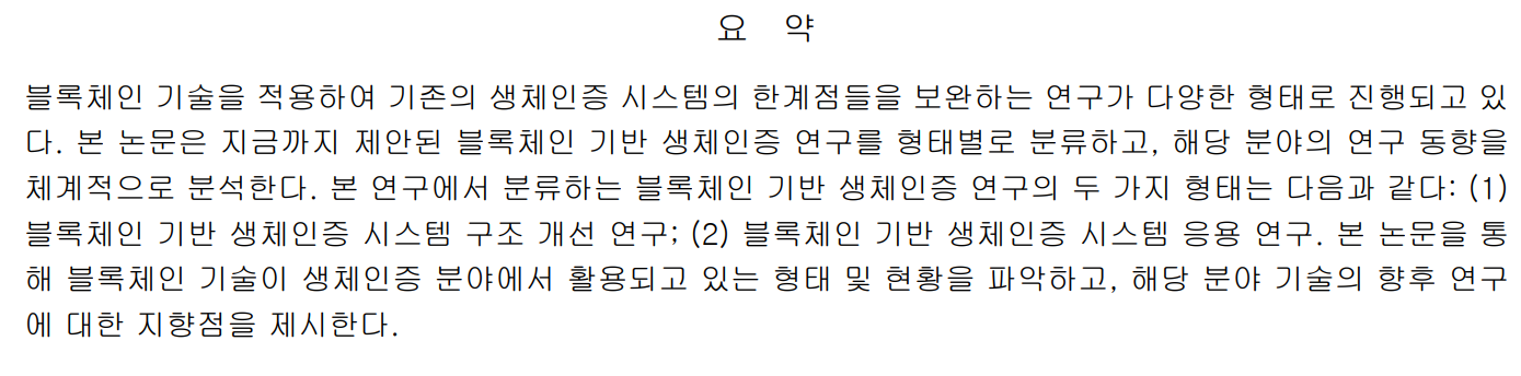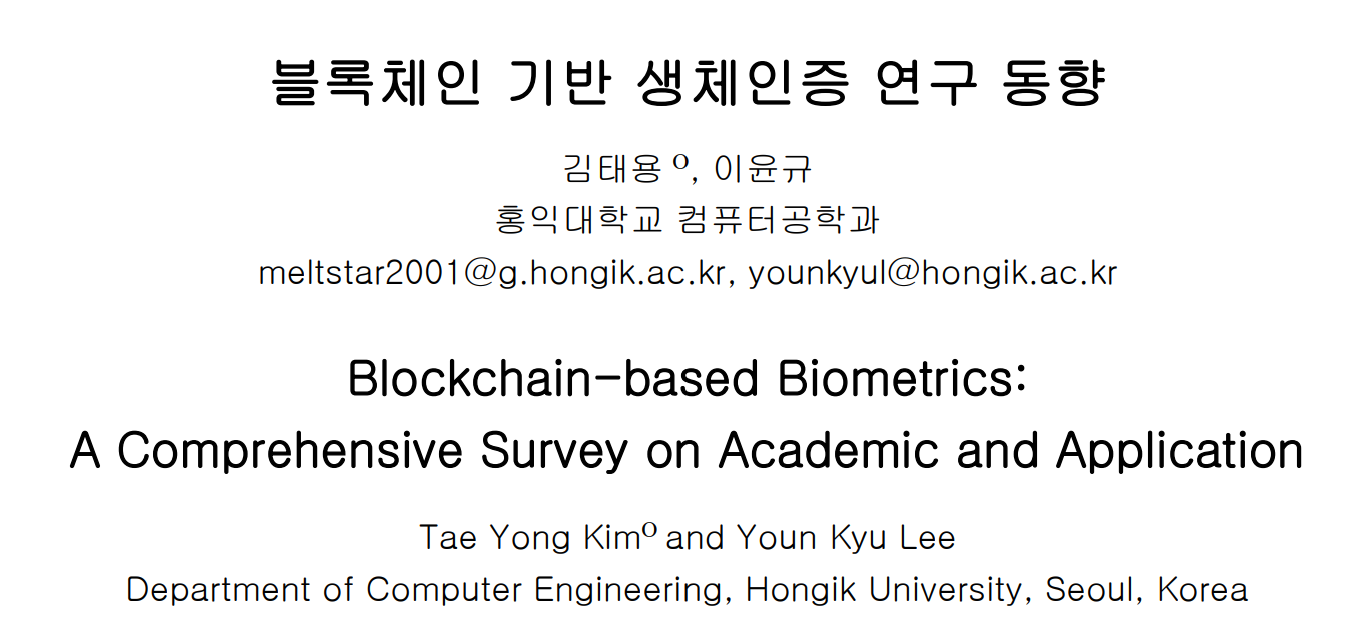 오늘 예시로 든 논문은 '블록체인 기반 생체인증 연구 동향(2022, 김태용, 이윤규)'이다.