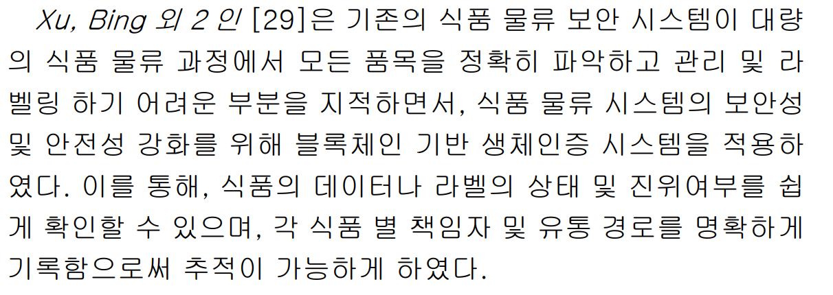 읽다가 관심을 끄는 추가적인 정보가 나왔을 경우, 해당 논문을 추가적으로 확인해서 더 많은 정보를 얻어보자. 예를 들어 XU, Bing 외 2인의 식품 물류 보안 시스템에 블록체인 기술을 적용하는 방안에 관심이 생겼다면, 해당 논문을 읽어보자.