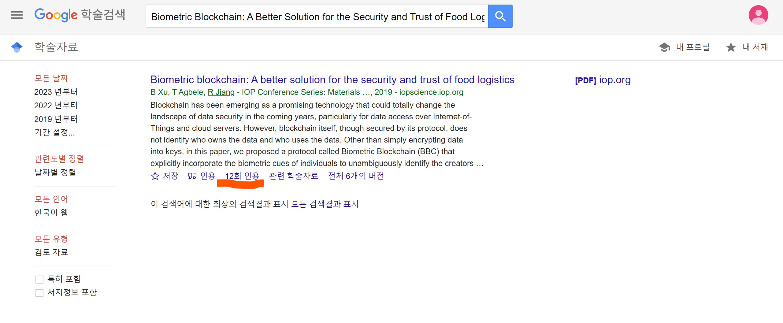 예를 들어 위에 논문 Biometric blockchain: A better solution for the security and trust of food logistics. In IOP Conference Series: Materials Science and Engineering 을 읽고 나서, 해당 분야에 대해서 더 추가적인 정보를 얻고자 한다면, 해당 논문을 인용한 다른 논문을 확인해보자.
