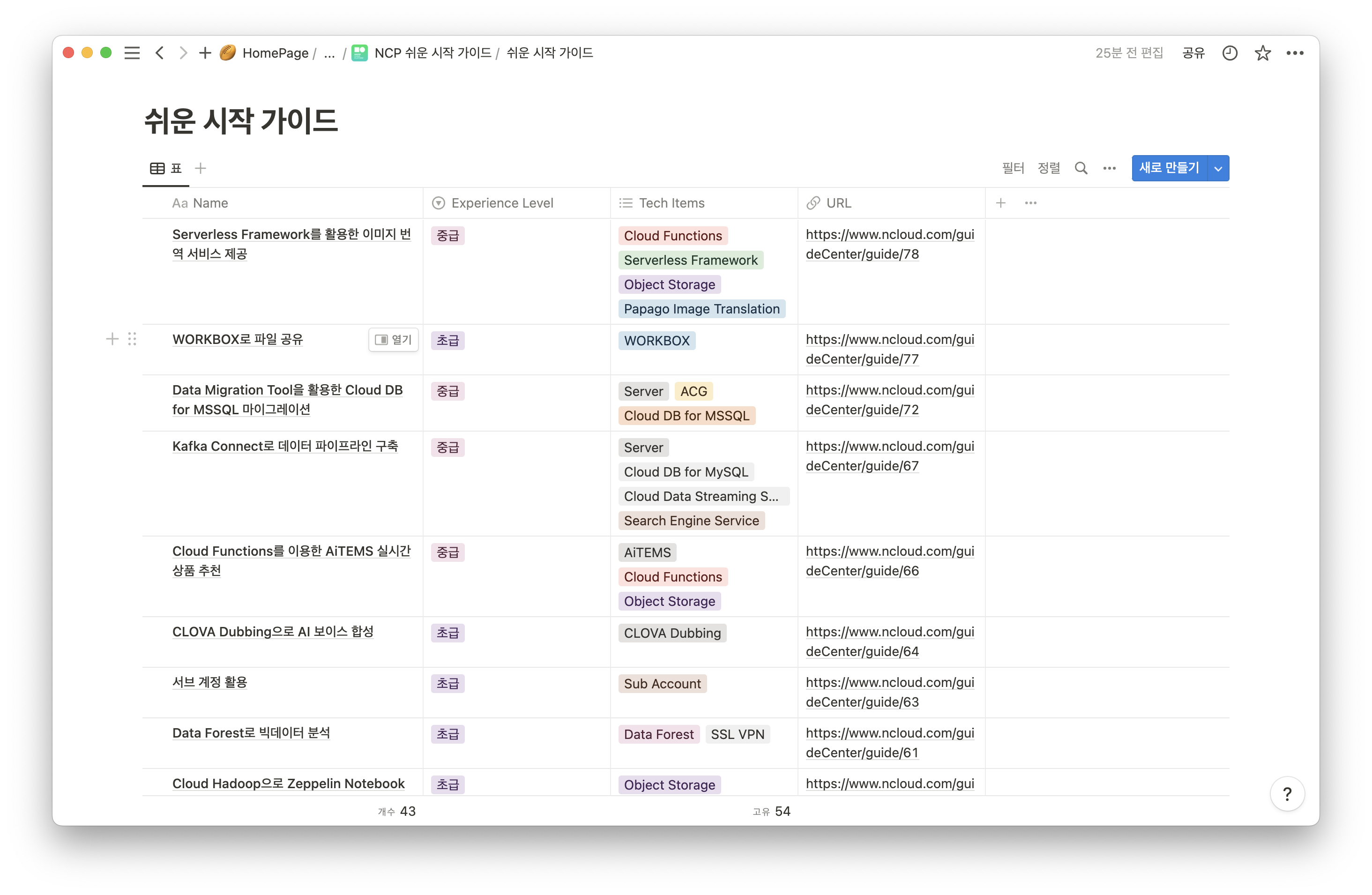 Notion DB는 필터링이 가능하다. 사실 내가 원하던 기능이 바로 이거였는데, Naver Cloud Platform에서는 Essential Guide라고 해서 동영상으로 된 강의를 제공을 한다. 총 10개의 동영상 강의가 제공되는데, 이 10개 각각의 내용에 연관된 쉬운 시작 가이드 문서를 필터링해서 링크하고 싶었다.