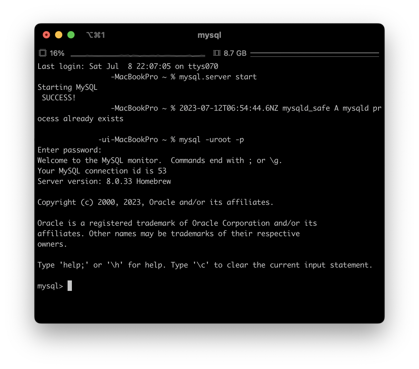 그렇다면 패스워드를 입력하라는 커맨드가 뜨는데, 이때 이전에 설정해둔 패스워드를 입력하고 진입하면 된다. MySQL 커맨드 창이 뜰 것이다.