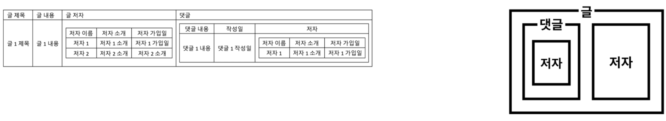 현실에서의 관점에서, 글과 댓글, 저자에 대한 구성은 위와 같이 생각해볼 수 있겠다. 그러나 관계형 데이터베이스에서는 위와 같은 내포 구조를 허용하지 않는다.