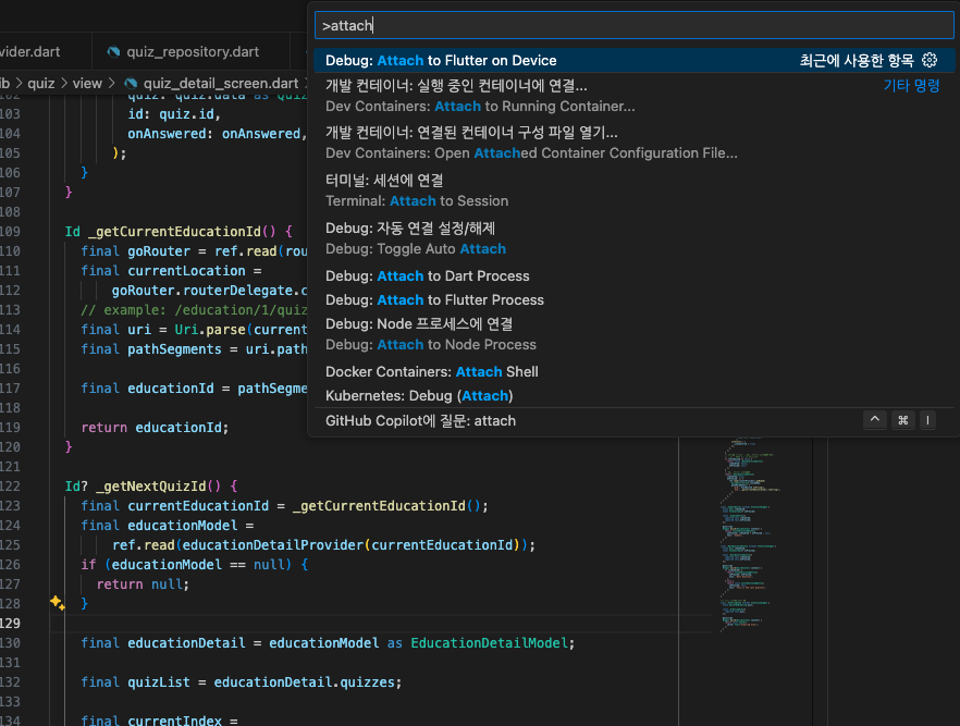 Exited (1).글에서도 이미 터미널에서 flutter attach를 실행하였기에 같은 에러가 발생했다.