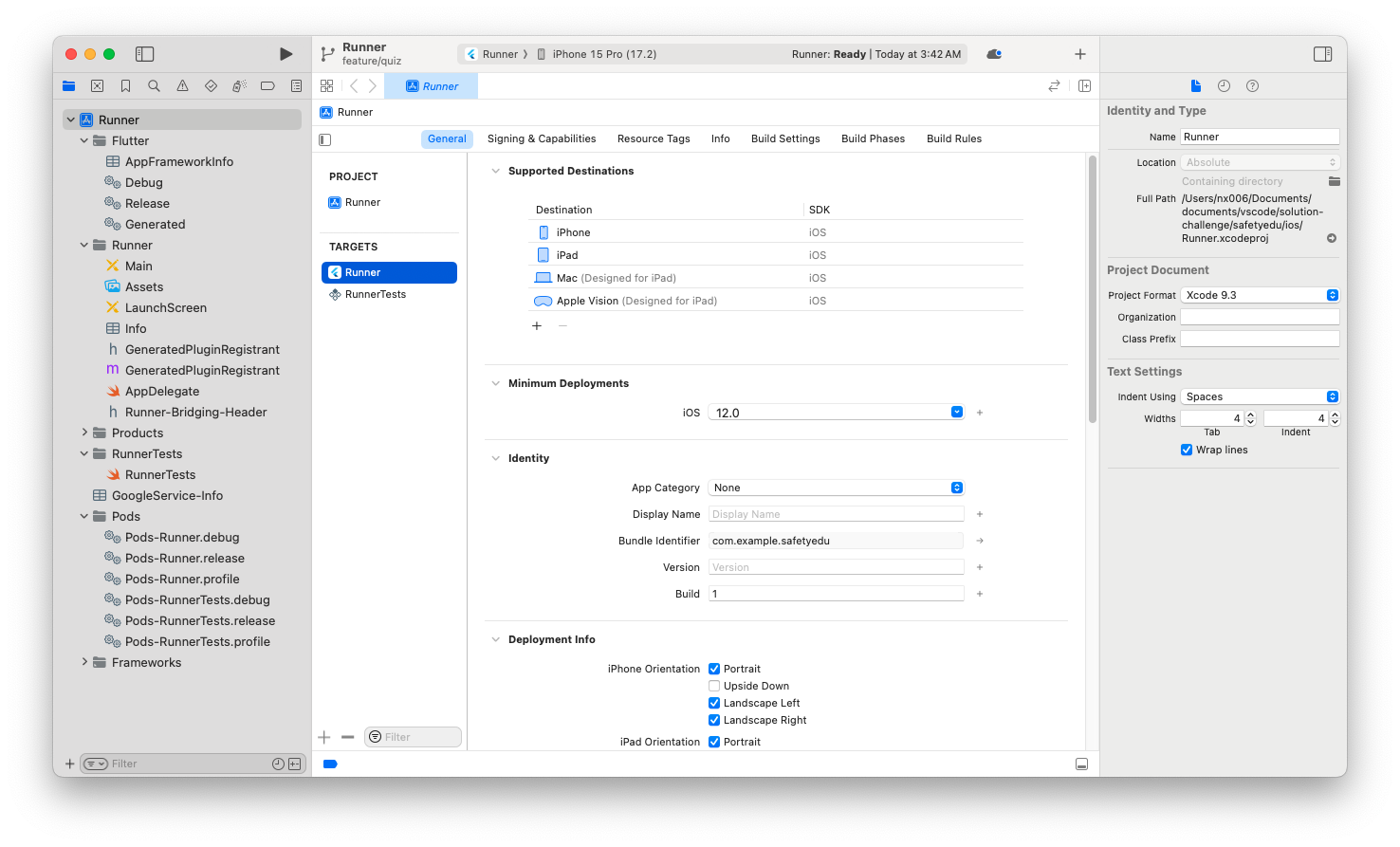 여기서 설정을 변경하면 이는 실제 ios/Runner.xcworkspace/contents.xcworkspacedata 파일이나 ios/Runner.xcodeproj/project.pbxproj 파일 등 ios 폴더의 설정 파일에 반영이 된다.